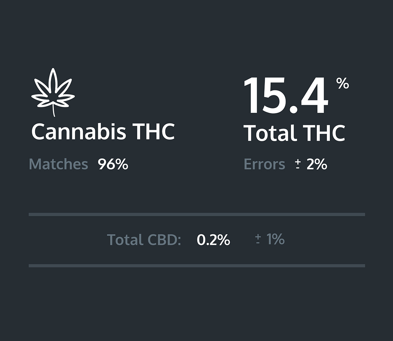 For example, our handheld analyzer can identify and quantify agents such as THC, CBD, CBN, CBG, HHC, Moisture, Water Activity and more.