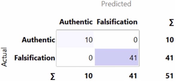 Classification accuracy reached near-perfect levels, with no overlap between groups after preprocessing. No false positives were reported, ensuring reliable identification of counterfeits. This high sensitivity is crucial for field applications where quick decisions can prevent dangerous fakes from entering the market.
